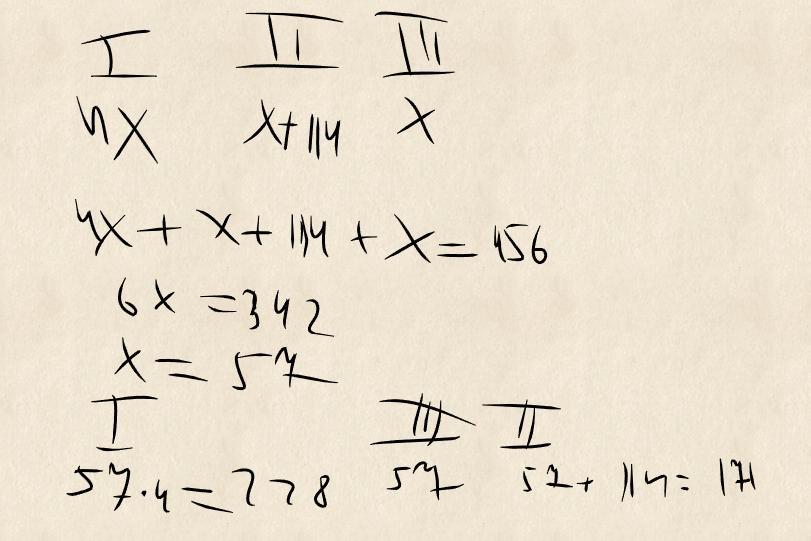 Брус завдовжки 456м розрізали на три частини причому перша частина у 4 рази довша за третю а друга на 114 метрів довша за третю знайдіть довжину кожної частини