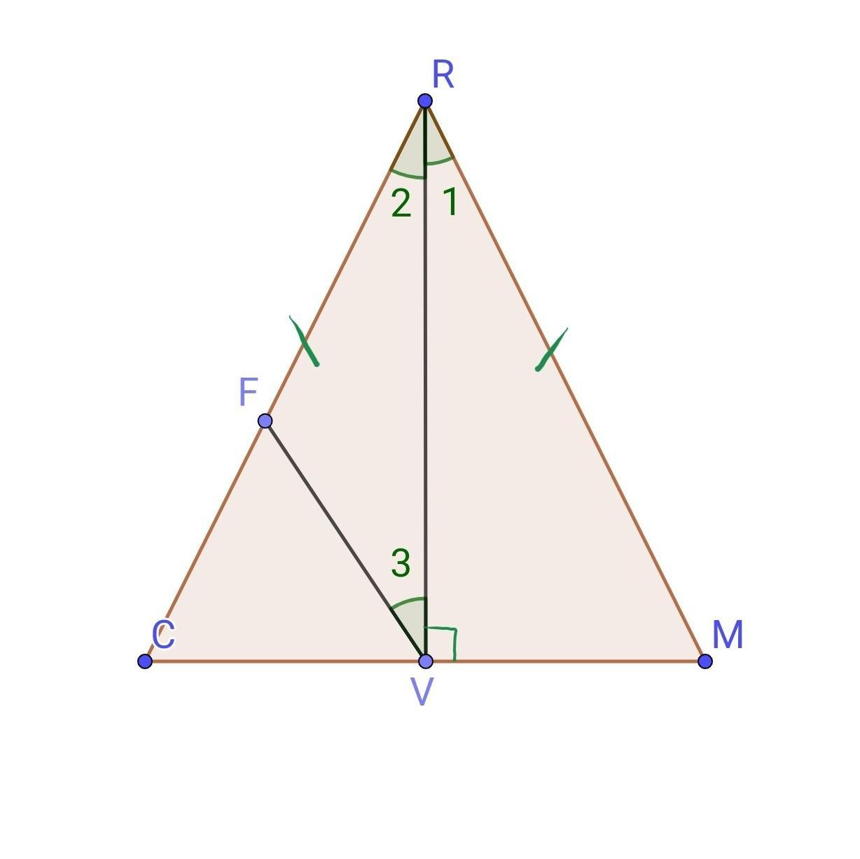 Відрізок RV — висота рівнобедреного трикутника CRM (CR=RM). На стороні CR позначили точку F так, що FV||RM. Доведіть, що FR = FV.