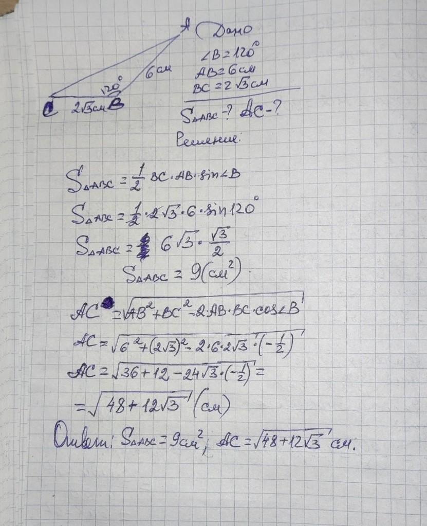 Знайти площу трикутника АВС та сторону АС, якщо АВ=6 см,