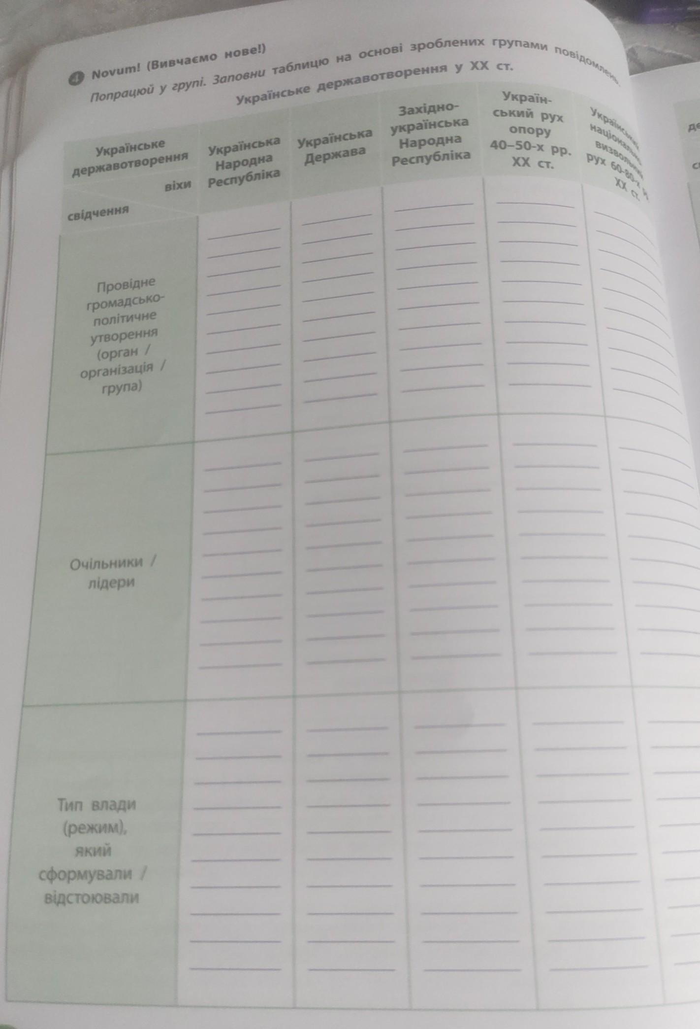 Novum! (Вивчаємо нове!) Попрацюй у групі. Заповни таблицю на основі зроблених групами повідомлень Українське державотворення у ХХ ст. Украïнське державотворення свiдчення Провідне громадсько- політичне утворення Українська Народна вiхи Республіка (орган / органiзацiя/ група) Очільники / лідери Тип влади (режим), який сформували / відстоювали Українська Держава Західно- українська Народна Республіка Україн- ський рух опору 40-50-х рр. ХХ ст. национални PEX 60-80 XX a. Ук держ свід помогите пж даю 50 балов
