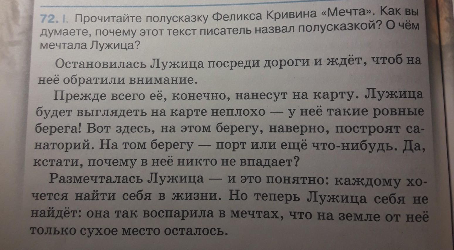72. |. Прочитайте полусказку Феликса Кривина «Мечта». Как вы думаете, почему этот текст писатель назвал полусказкой? О чём мечтала Лужица? помогите пожалуйста
