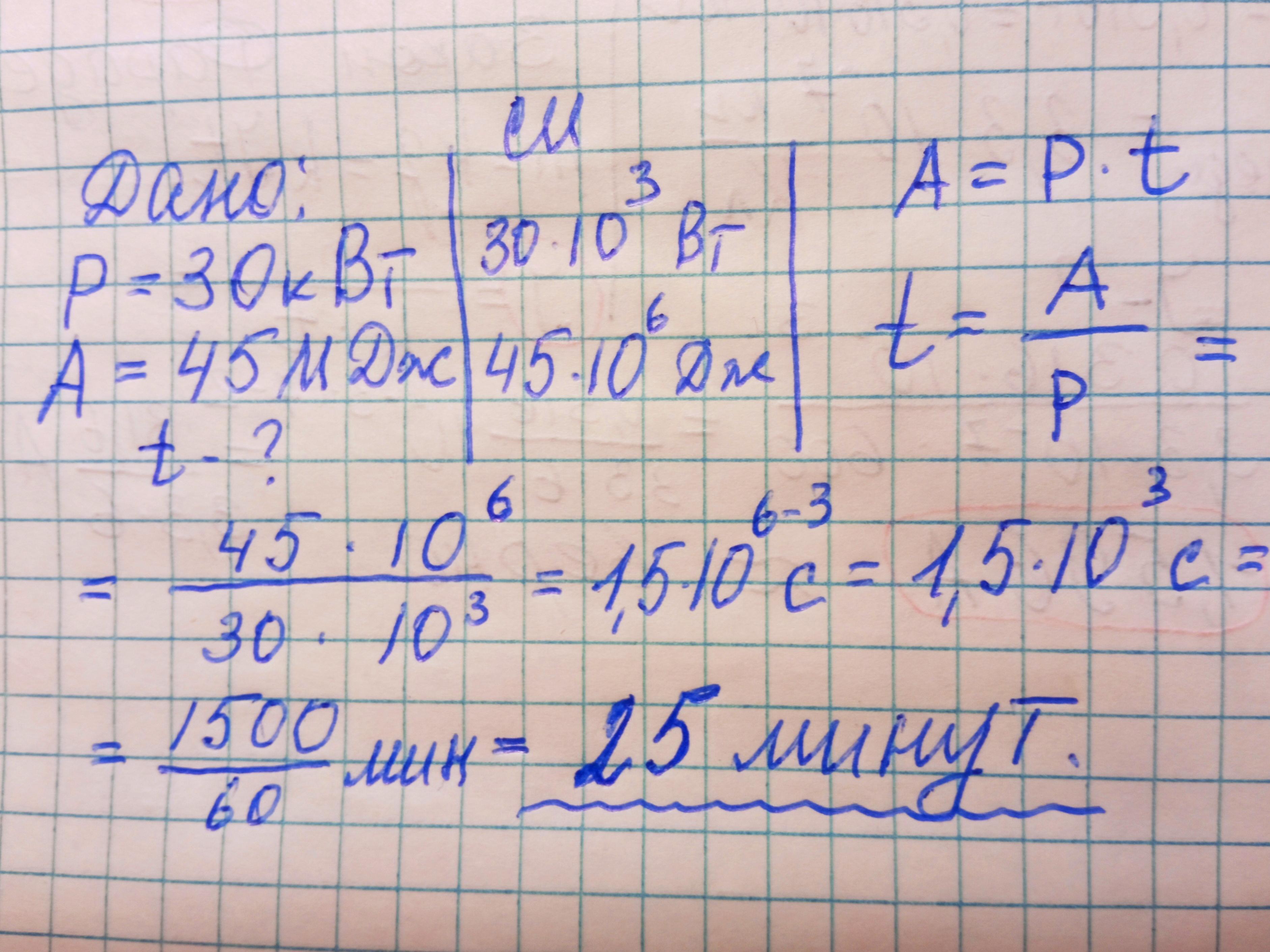 N=A/t→t=A/N=4,5*10⁷/3*10⁴=1500c=25хв