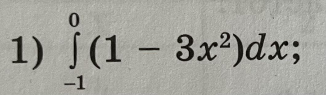 ∫₋₁⁰(1-3x²)dx = ∫₋₁⁰(1)dx - ∫₋₁⁰(3x²)dx =x|₋₁⁰ -3(x³/3)|₋₁⁰ =(0-(-1)) - 3/3(0³-(-1)³) =