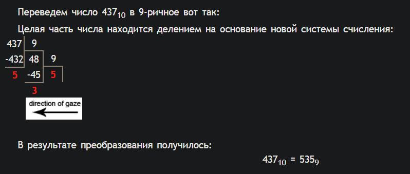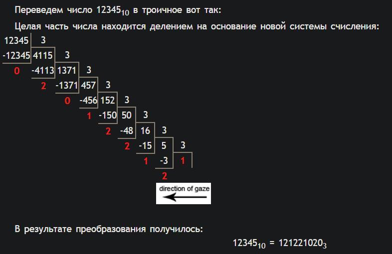 Нужно разделить число на основание системы счисления, в которую мы переводим, после чего записать его остаток ПРАВЕЕ ВСЕГО. Далее полученное после деления частное нужно снова разделить на основание, и полученный остаток записать в конечном числе ЛЕВЕЕ ПРЕДЫДУЩЕГО. Повторять до тех пор, пока не останется число, которое меньше основания. Его нужно записать левее всего. Я приведу пример на картинке.