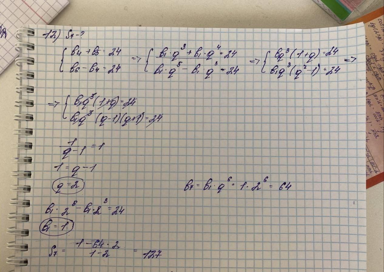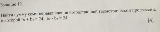Задание 12. Найти сумму семи первых членов возрастающей геометрической прогрессии в которой b4+ b5=24, b6-b4=24.