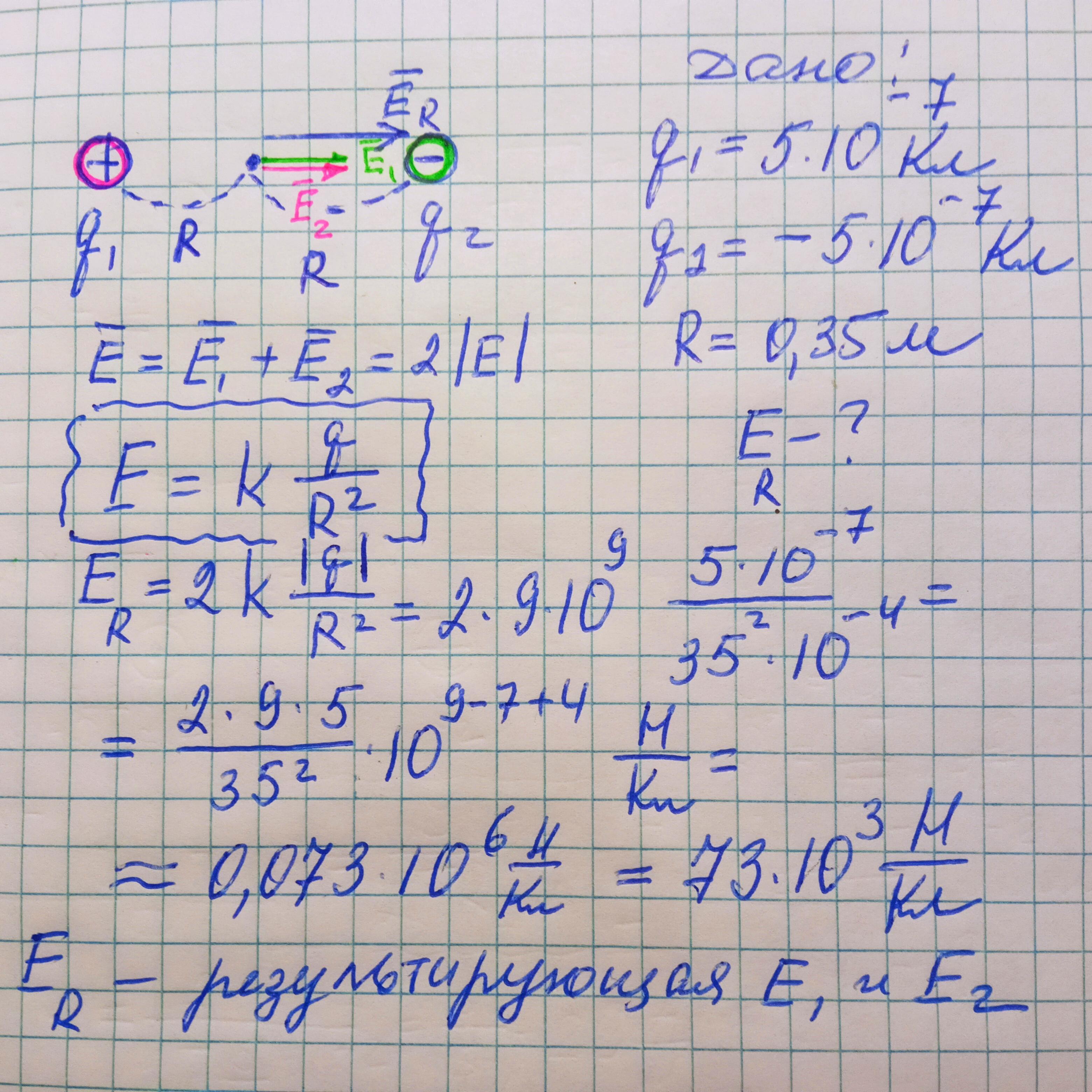 Расстояние между двумя однородными точечными зарядами -5•10^-7 Кл равно 0,7 м. Чему равна напряженность электрического поля в середине линии, соединяющей заряды? Для одноименных зарядов Е=0. Для разноименных на фото.