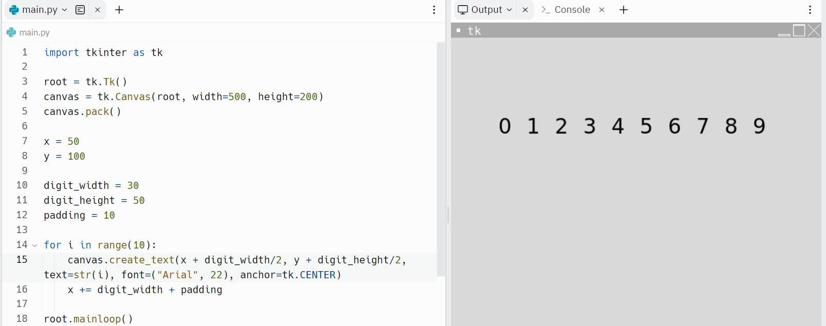 canvas.create_text(x + digit_width/2, y + digit_height/2, text=str(i), font=("Arial", 22), anchor=tk.CENTER)