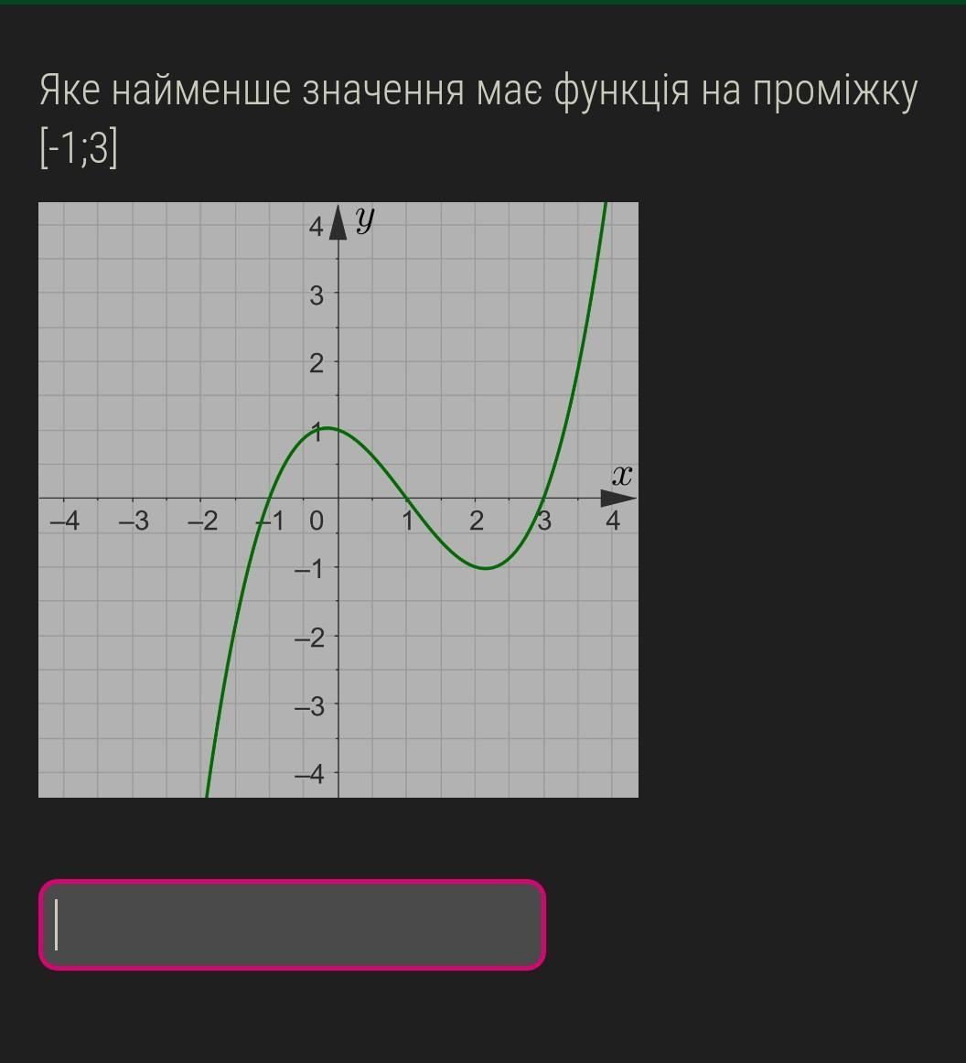 На графіку, обмеженому по осі х від точки (-1;0) до (3;0), точкою з найменшим значенням функції (найменшим у) є точка (~2;-1), тобто найменше значення графіку відносно осі у в проміжку від точки (-1;0) до (3;0) становить -1