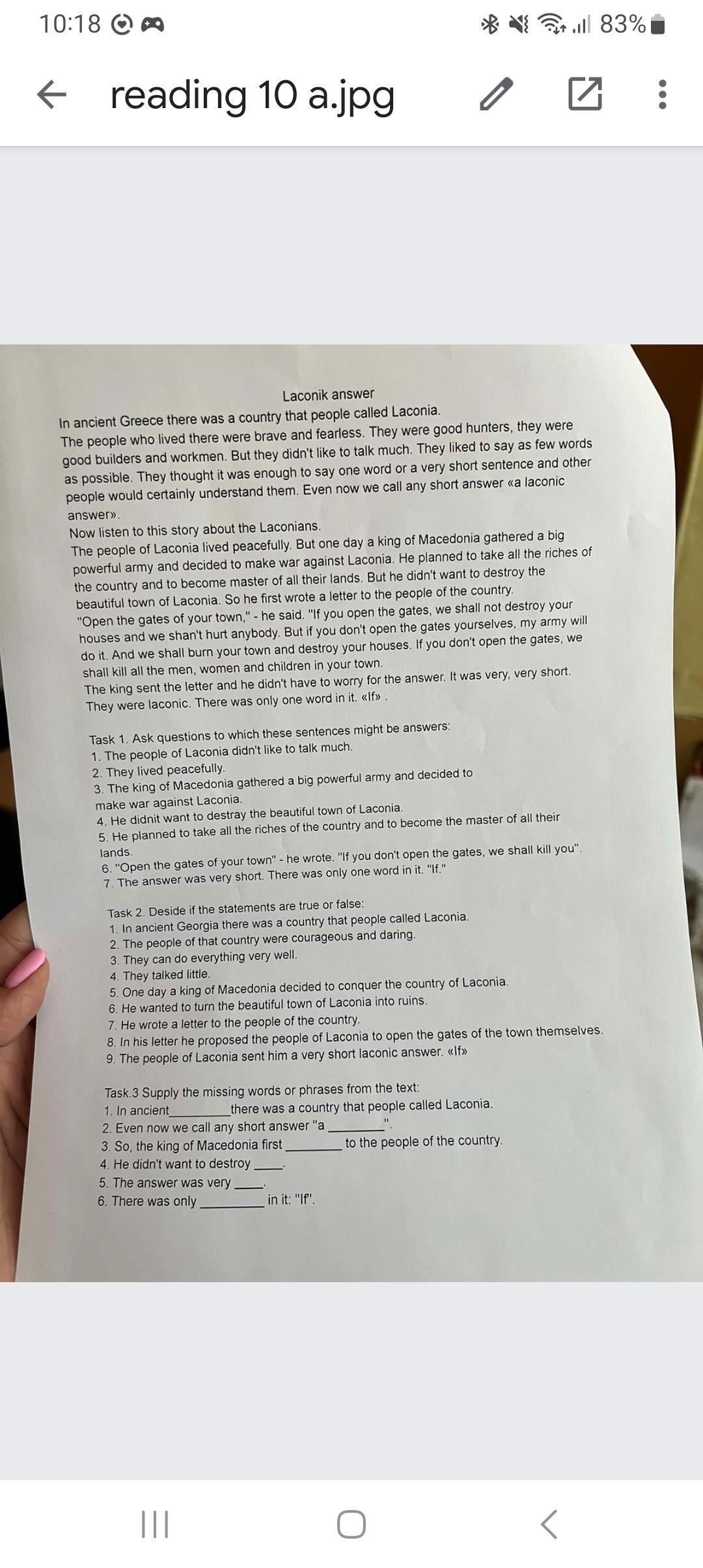 Task 1. Ask questions to which these sentences might be answers: 1. The people of Laconia didn't like to talk much. 2. They lived peacefully. 3. The king of Macedonia gathered a big powerful army and decided to make war against Laconia. 4. He didnit want to destray the beautiful town of Laconia. 5 He planned to take all the riches of the country and to become the master of all their lands 6. "Open the gates of your town" he wrote. "If you don't open the gates, we shall kill you". 7. The answer was very short. There was only one word in it. "It." Task 2 Deside if the statements are true or false 1. In ancient Georgia there was a country that people called Laconia. 2. The people of that country were courageous and daring 3. They can do everything very well. 4 They talked little. 5. One day a king of Macedonia decided to conquer the country of Laconia 6. He wanted to tum the beautiful town of Laconia into ruins 7. He wrote a letter to the people of the country. 8. In his letter he proposed the people of Laconia to open the gates of the town themselves