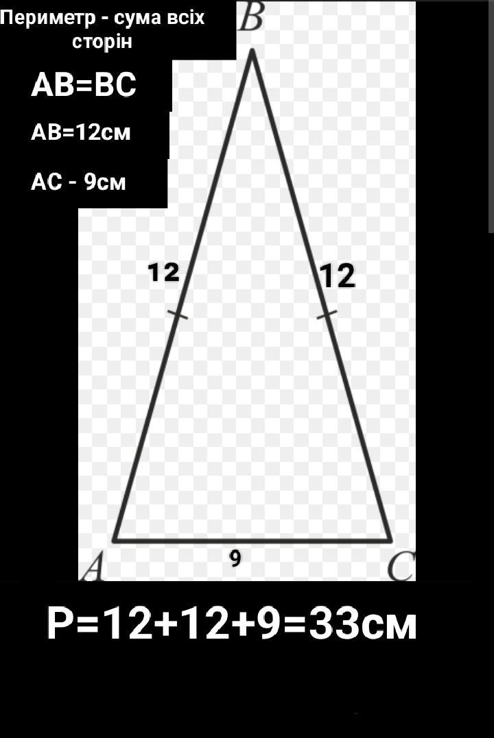 Тобто периметр трикутника буде дорівнювати P= 12+12+9= 33см