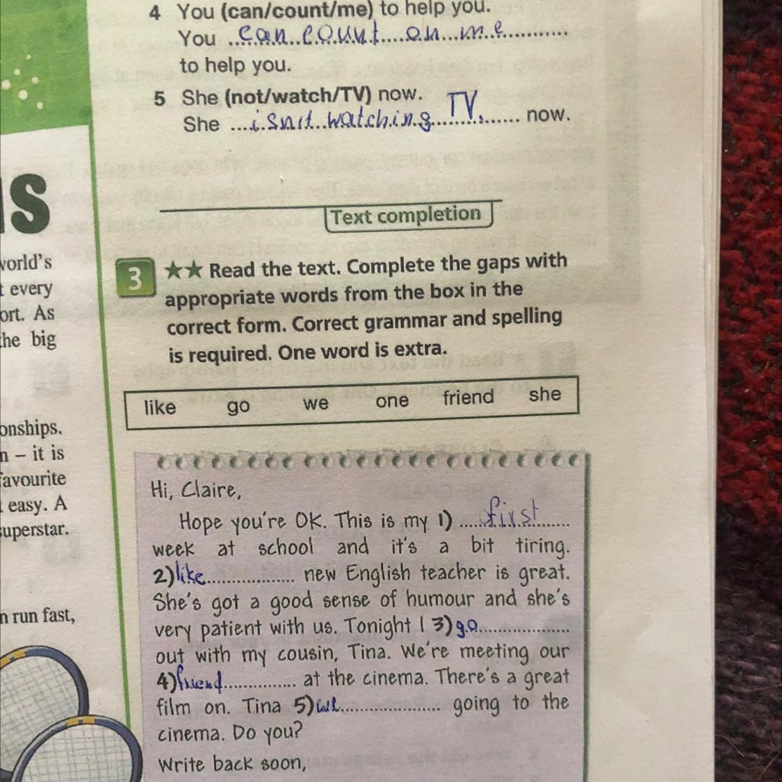 2) Our new English teacher is great. She's got a good sense of humour and she's very patient with us. Tonight (3) we're going out with my cousin, Tina. We're meeting our 4) friends at the cinema. There's a great film on. Tina 5) likes going to the cinema. Do you?