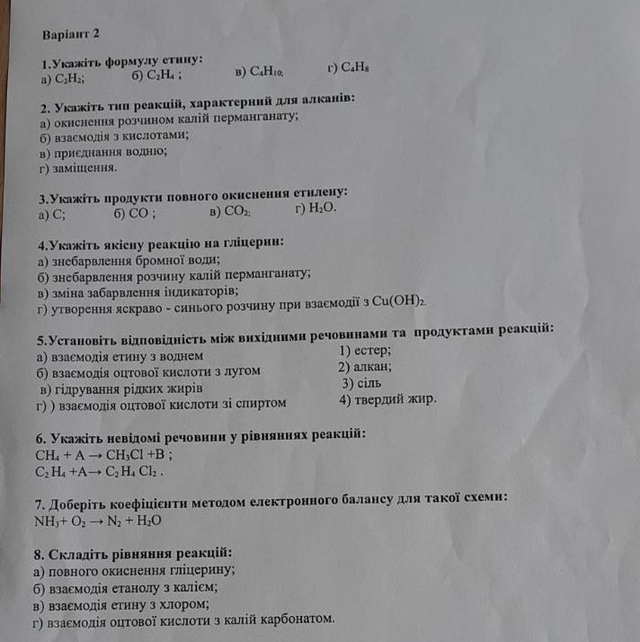 8. Складіть рівняння реакцій: а) повного окиснення гліцерину; б) взаємодія етанолу з калієм; в) взаємодія етину з хлором;