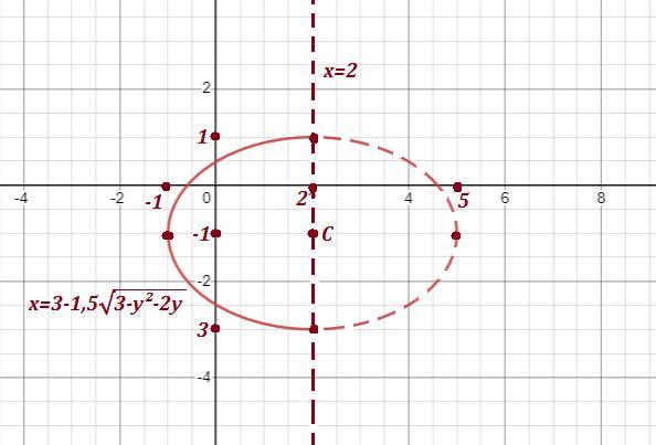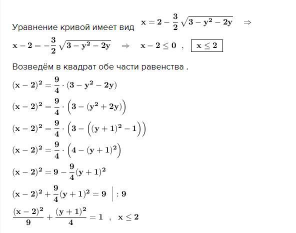 Получили , что заданной кривой является половина эллипса, которая расположена левее прямой х=2 . Эта половина на чертеже нарисована сплошной линией .