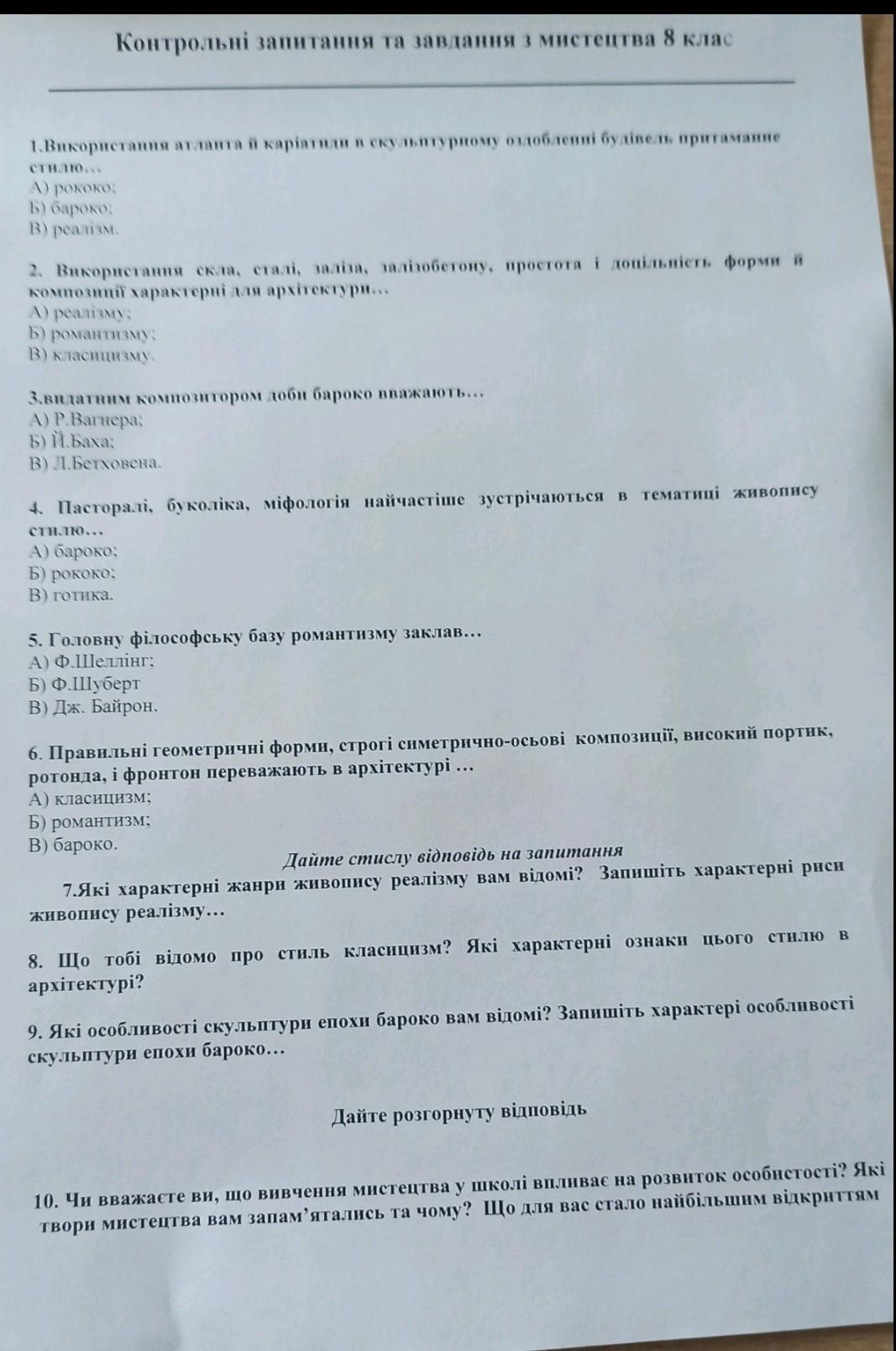 8) Класицизм — напрям в європейському мистецтві, який уперше заявив про себе в культурі XVI ст. Найбільшого розквіту досягає у Франції. Для класицизму важливим був принцип свободи вибору — необмеженість власного, суб'єктивного трактування історичних форм. Для архітектурних споруд класицизму характерні: геометрична правильність об'ємів; чіткий і спокійний ритм; врівноваженість, логічність планування.