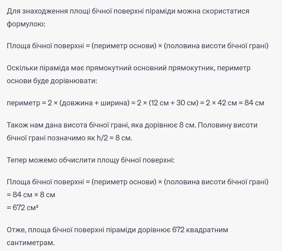 Основою піраміди є прямокутник зі сторонами 12 см і 30 см. Знайдіть площу бічної поверхні піраміди, якщо її висота дорівнює 8 см, а бічні ребра утворюють з площиною основи рівні кути.