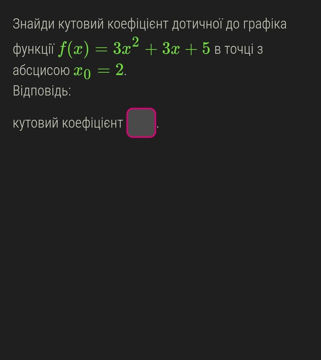 Знайди кутовий коефіцієнт дотичної до графіка функції f(x)=3x2+3x+5 в точці з абсцисою x0=2.