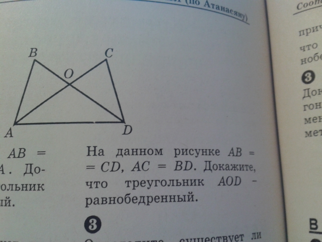 треуг ВОА= треуг СОД (1-ый призн, по 2 -ум торонам у углу между ними), значит АО=ОД , треуг АОД-равнобедр
