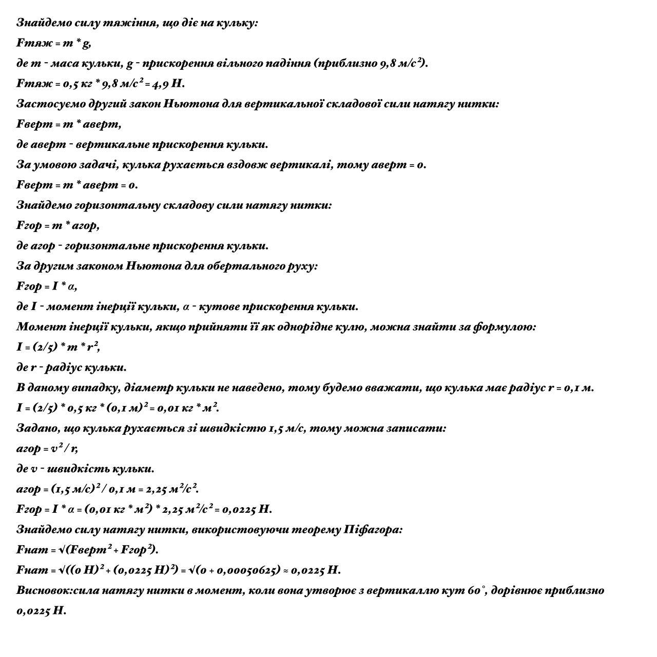 Кулька масою 500 г. підвішена на нерозтяжній нитці довжиною 1 м, робить коливання у вертикальній площині. Знайти силу натягу нитки в момент, коли вона утворює з вертикаллю кут 60°. Швидкість кульки в цей момент 1,5 м/с