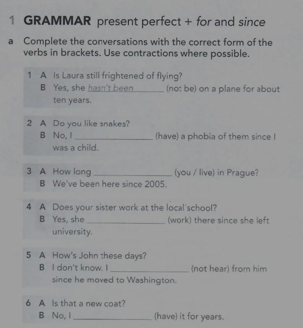 a Complete the conversations with the correct form of the verbs in brackets. Use contractions where possible. 1 A Is Laura still frightened of flying? B Yes, she hasn't been ten years. 2 A Do you like snakes? B No, I was a child. 3 A How long B We've been here since 2005. university. (no: be) on a plane for about 5 A How's John these days? I don't know, I B (have) a phobia of them since I 4 A Does your sister work at the local school? B Yes, she 6 A Is that a new coat? B No, I (you / live) in Prague? (work) there since she left since he moved to Washington. (not hear) from him (have) it for years. срочноооооо!
