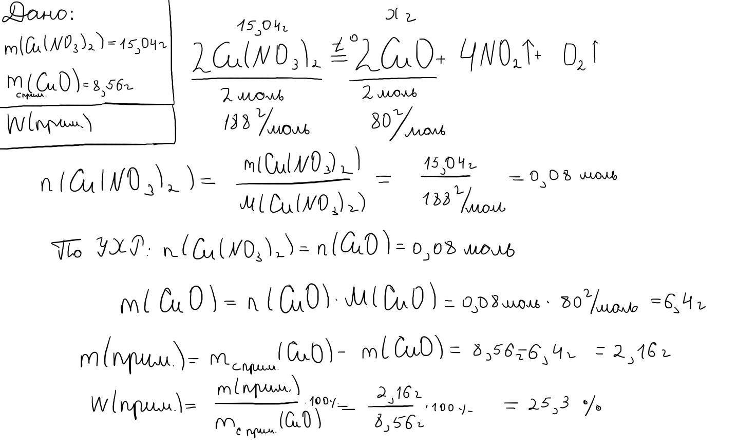 При розкладанні 15,04г нітрату купруму 2 утворилося 8,56г твердого залишку. Визначити масову частку домішок