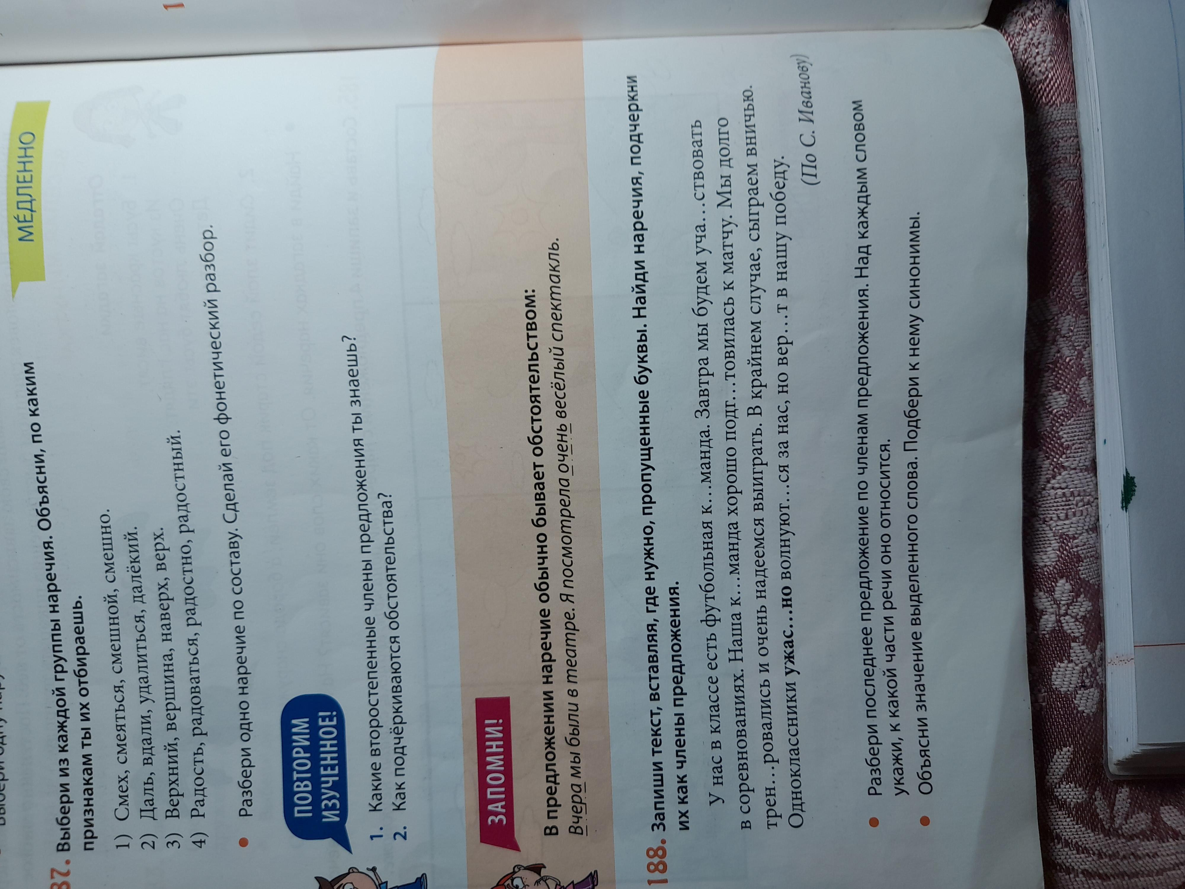 Запиши текст, вставляя, где нужно,пропущенные буквы.Найди наречия,подчеркни их как члены предложения. Упражнение номер 188