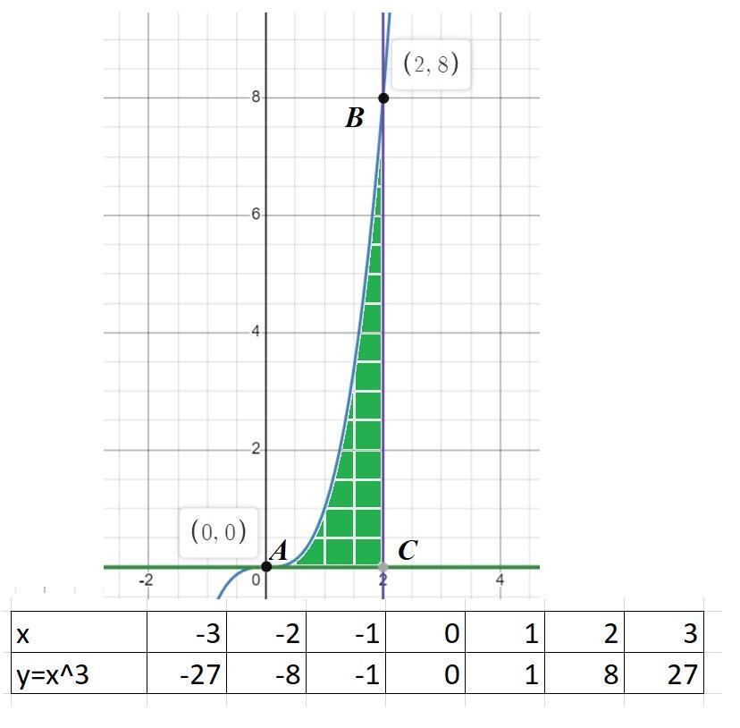 S=∫₀²(x^3)dx = 1/4(x⁴)|₀² = 1/4(2^4-0^4) = 16/4 = 4 кв. ед.