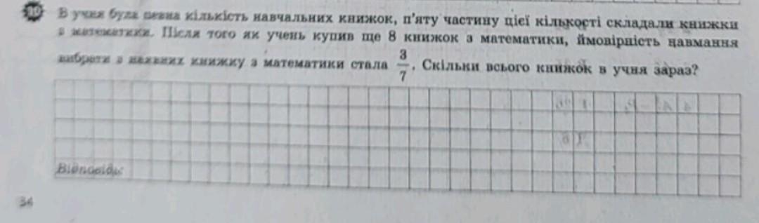 В учня була на кiлькiсть навчальних книжок, п'яту частину цієї кількості складали книжки . Після того як учень купив ще 8 книжок з математики, ймовірність навмання вибрати з них книжку з математики стала 3/7 Скільки всього книжок в учня зараз?