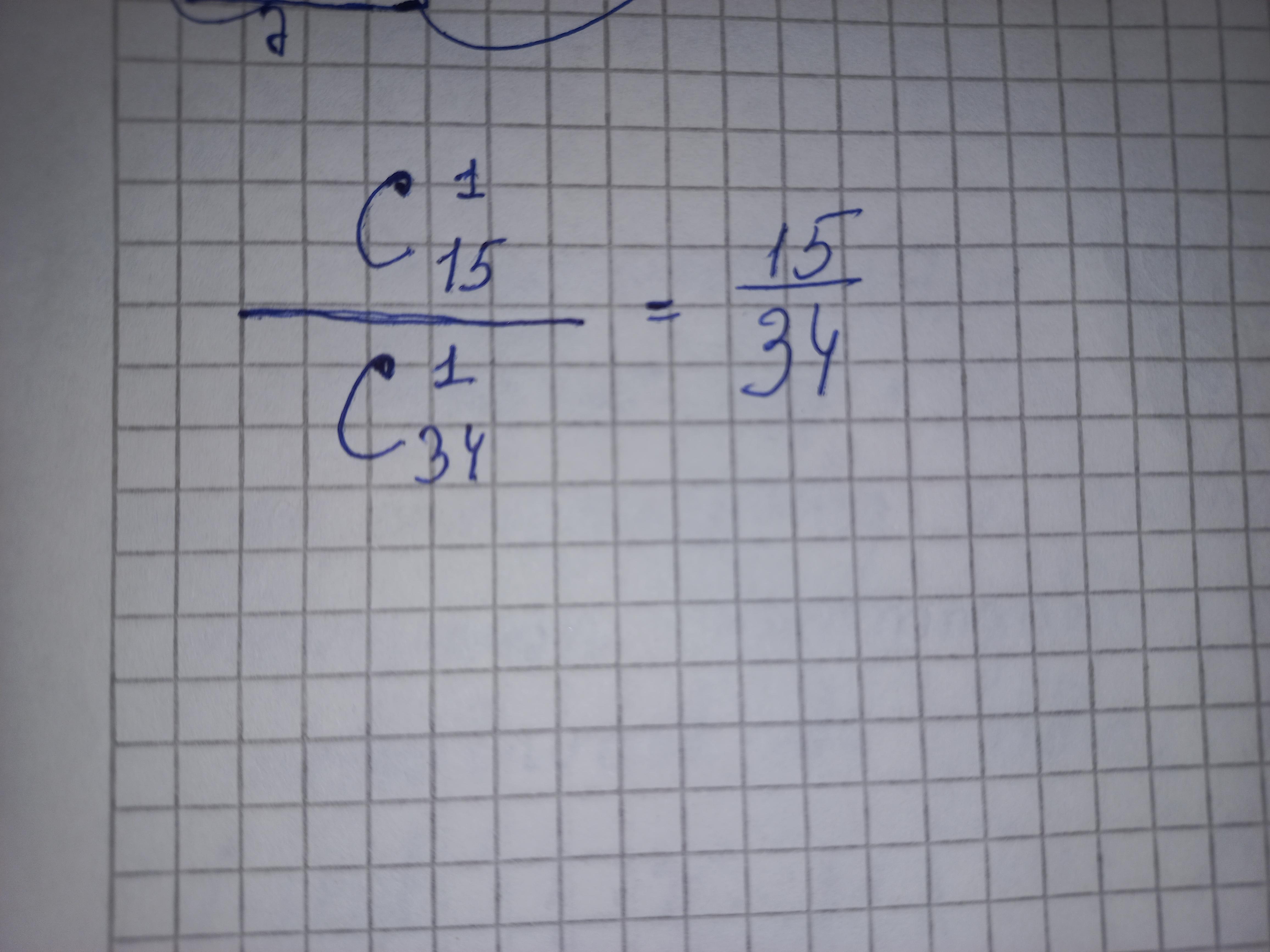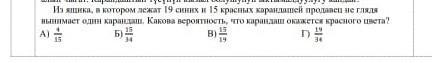 из ящика в котором лежат19 синих и 15 красных карандашей продавец не глядя вынимает один карандаш,какова вероятность того ,что этот карандаш будет красным