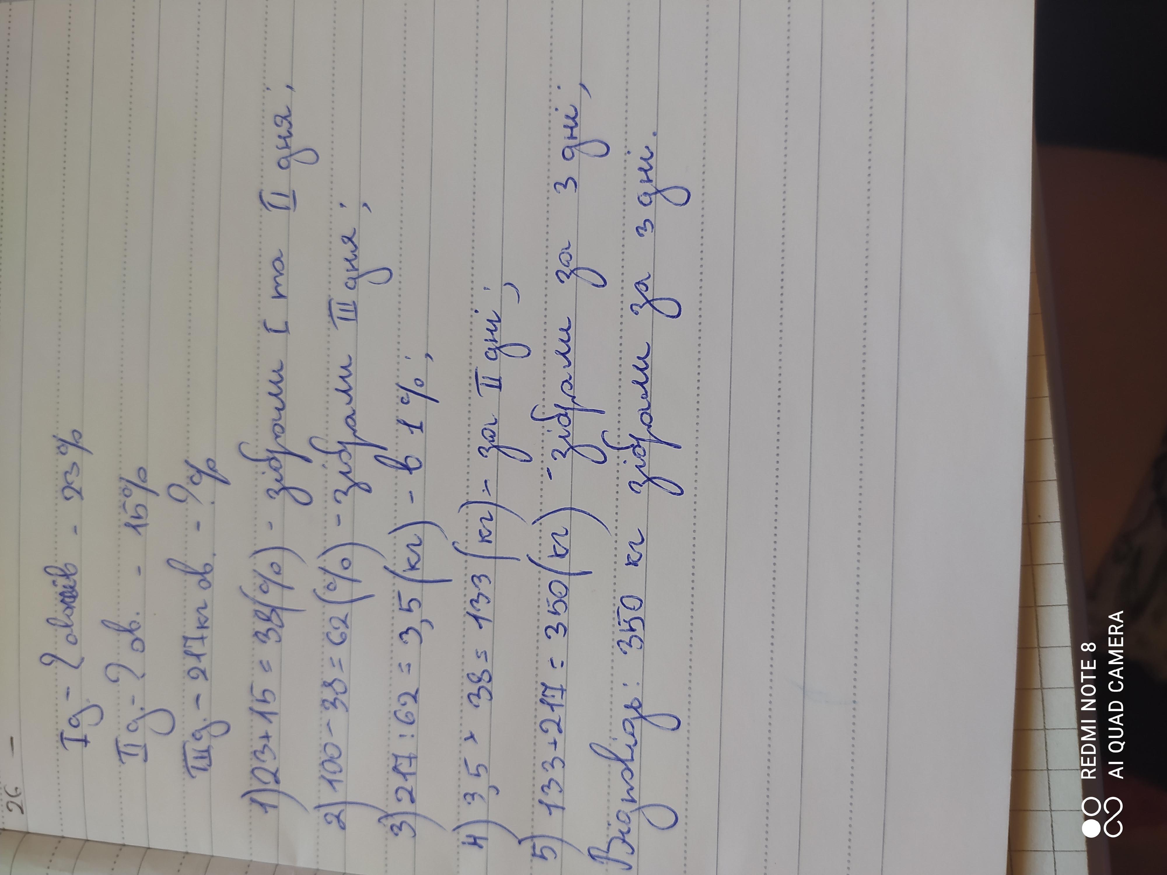 Першого дня було продано 23% усіх овочів, другого дня 15%, а третього дня решту 217 кг. Скільки кілограмів було продано за три дні?