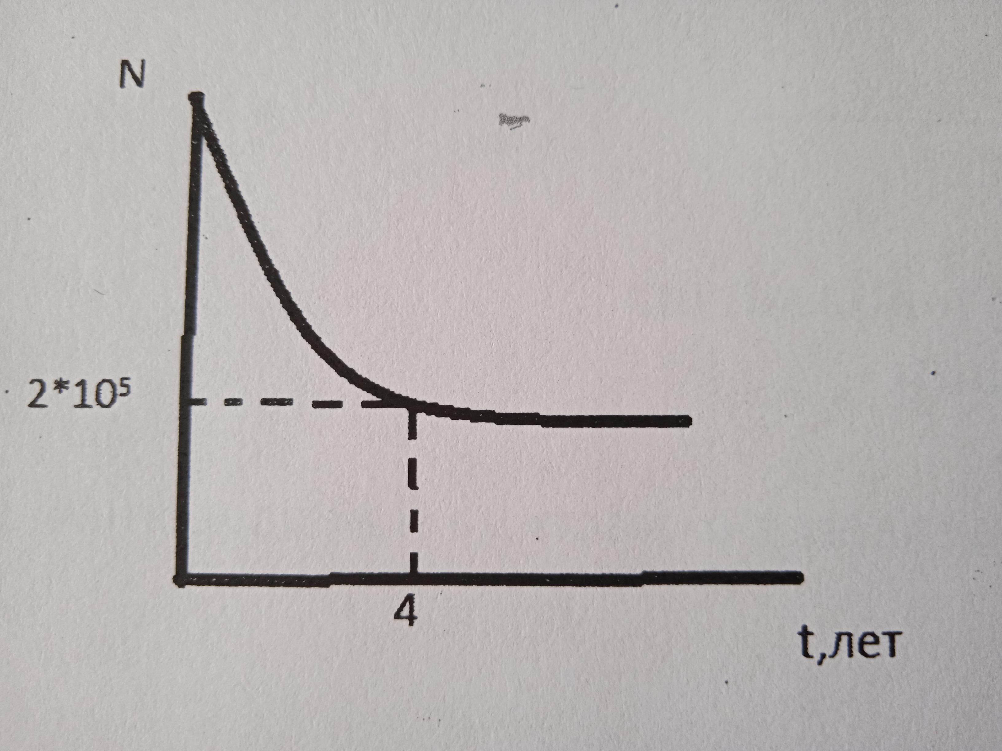 По графику зависимости числа нарставшихся радиоактивных ядер от времени вычислите начальное число ядер (период полураспада Т=2 года)