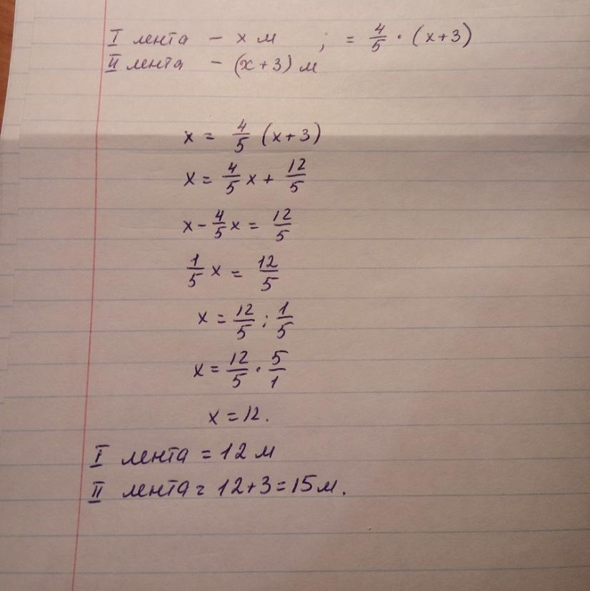 Стрічку розрізали на дві частини. Довжина другої частини на 3 м більша, ніж довжина першої, причому довжина першої частини становить 4/s довжини другої. Яка довжина кожної частини?
