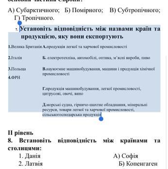 Установіть відповідність між назвами країн та продукцією, яку вони експортують