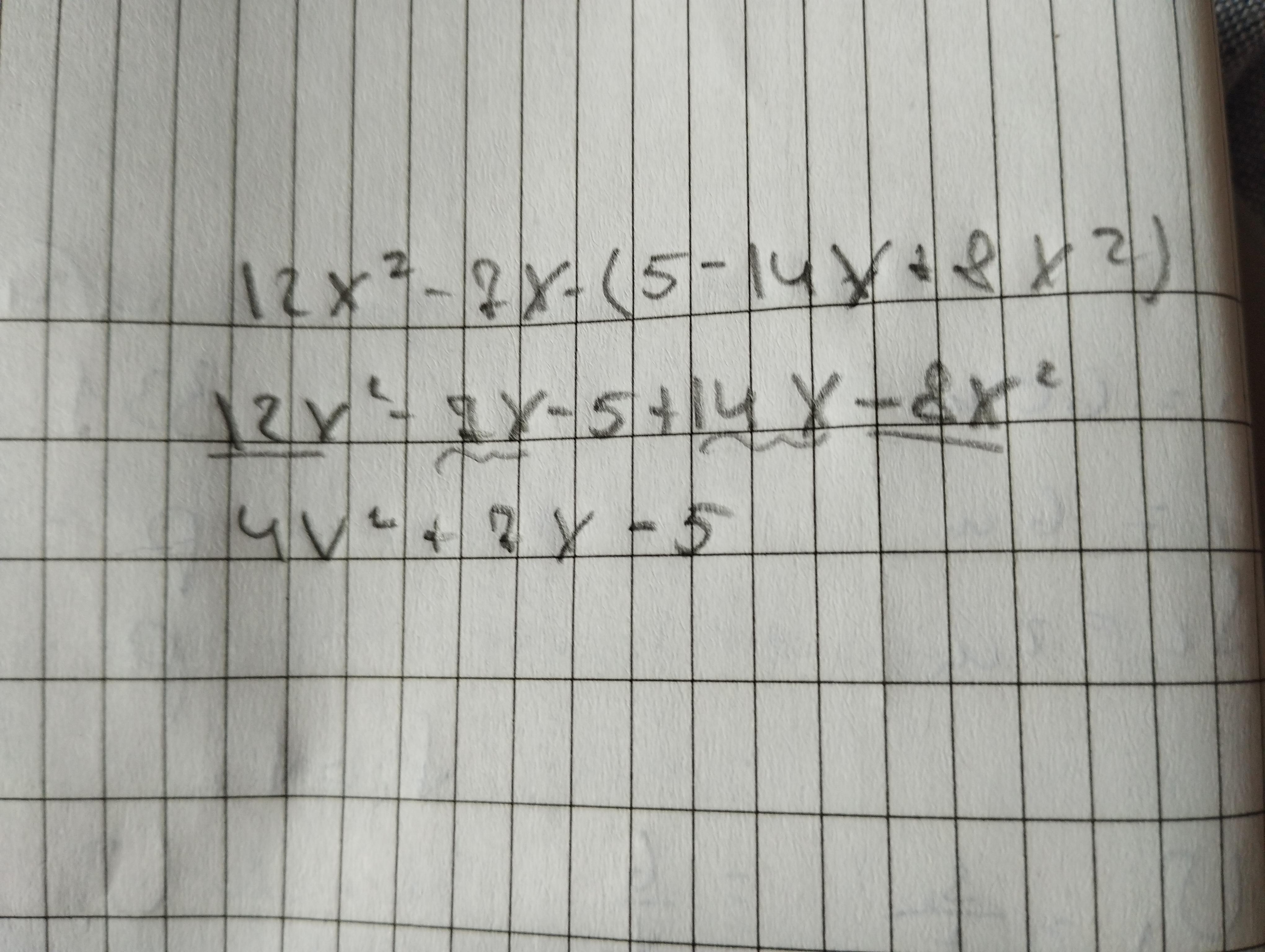 12х^2 - 7х - (5 - 14х + 8х^2) = = 12х^2 - 7х - 5 + 14х - 8х^2 =