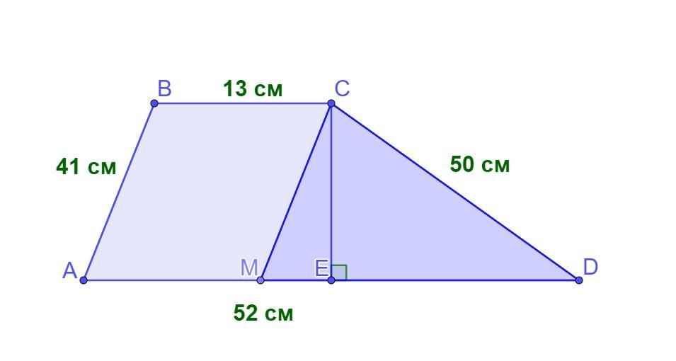 Нехай ABCD - дана трапеція, BC ║AD, АВ = 41 см, ВС = 13 см, CD = 50 cм, AD = 52 см.
