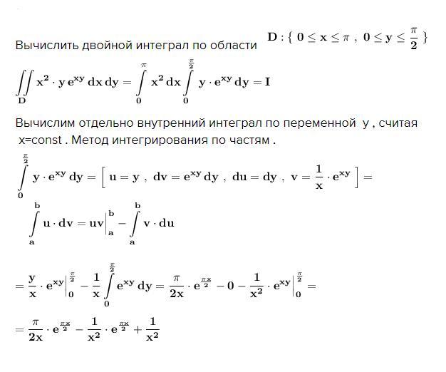 Вычислим отдельно внутренний интеграл по переменной у , считая х=const . Метод интегрирования по частям .