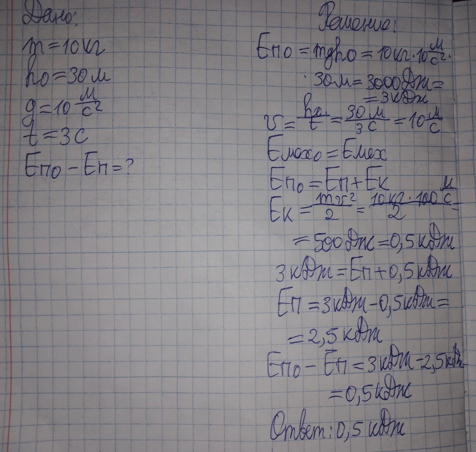 тіло масою 10кг вільно падає з висоти 30м на скільки зміниться його потенціальна енергія через 3 сек після початку падіння