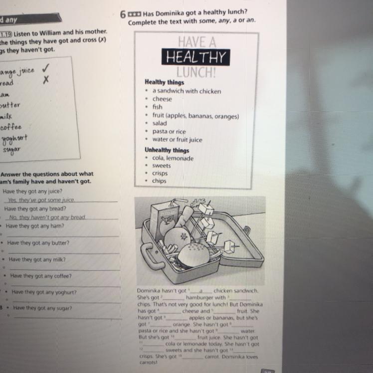 She's got "chips". That's not very good for lunch! But Dominika has got "cheese" and "fruit". She hasn't got "apples or bananas", but she's got an "orange". She hasn't got "pasta or rice" and she hasn't got "salad". But she's got "water" and "fruit juice". She hasn't got "cola or lemonade" today. She hasn't got "crisps". She's got "carrots"! Dominika loves carrots.