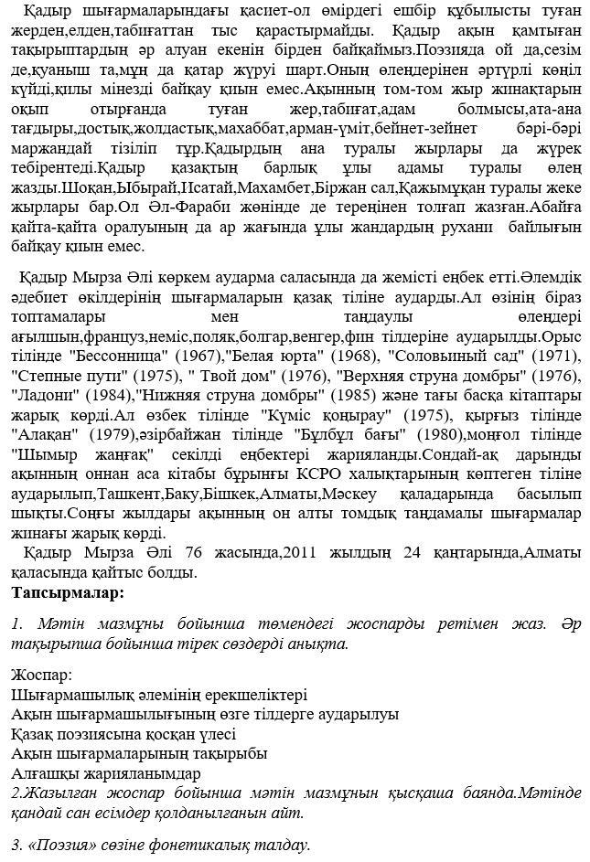 2.Қадыр Мырза Әлінің шығармалары әр адамның сезімін оятып, үлкен әсер қалдыратыны белгілі.Қадырдың қазақ поэзиясындағы үлесі зор. Осындай алып кісінің шығармаларының тақырыптары отан,табиғат,ата-ана,махаббат,достық және тағы да басқа елеулі дүниелерді қамтиды.Және де дәл осы ақынның жазғандары әлемнің бірнеше тілдеріне аударылып, КСРО халықтары қалаларында басылып шыққан.Бұндай талантты қазақ ақындары мыңда бір кездескен