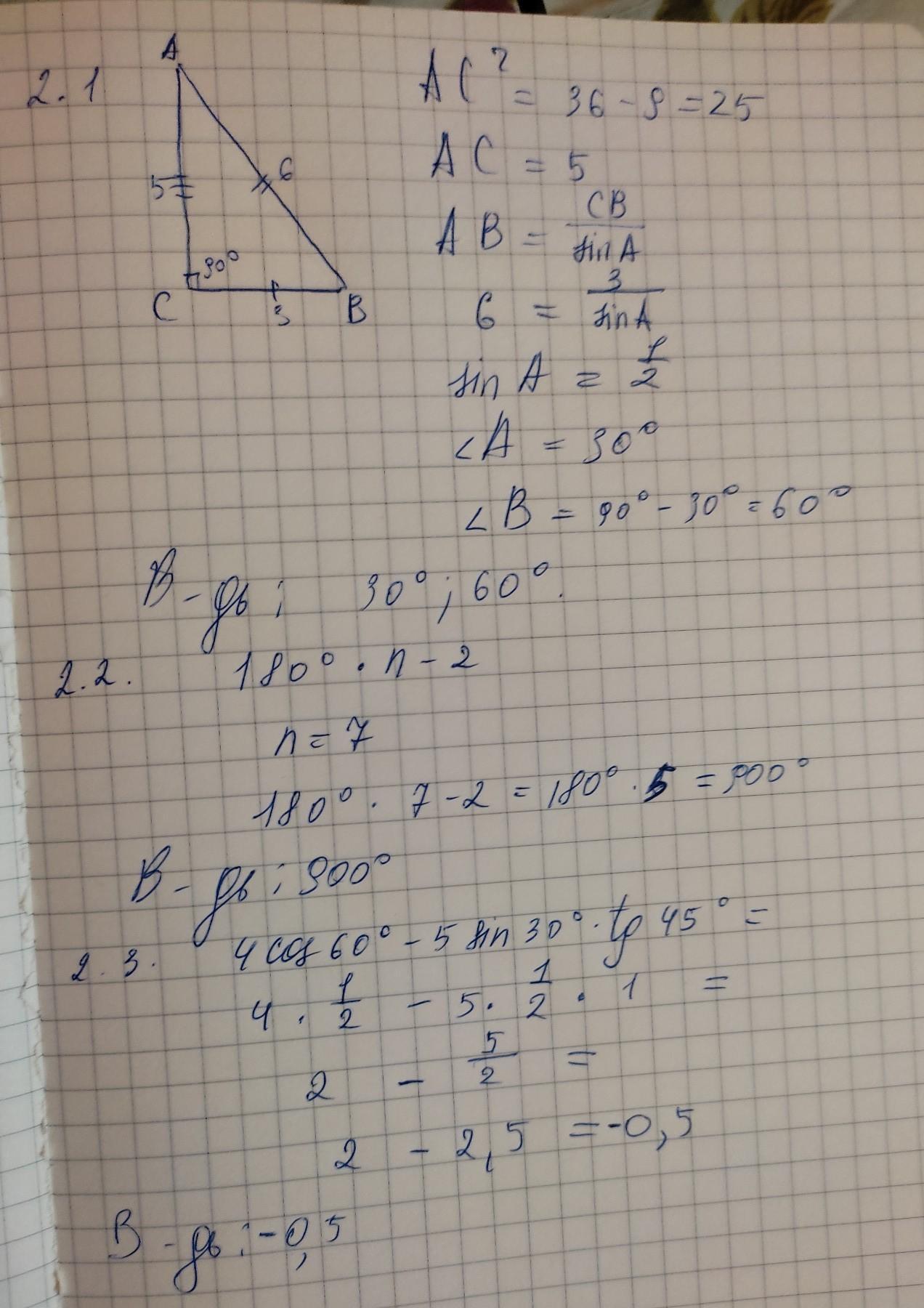 Розв'яжiть завдання ( 1 бал) 2.1 Знайдіть гострі кути прямокутного трикутника ABC, якщо кут С = 90°,AB = 6, СB =3. 2.2 Знайдіть суму кутів опуклого семикутника. 2.3 Обчисліть: 4 cos 60º - 5sin30º.tg 45º