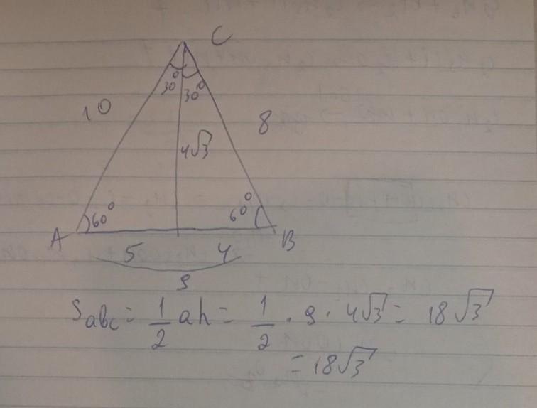В треугольнике ABC проведена высота CH. Известно, что угол BAC равен 60 градусов, сторона AC равна 10 см, а сторона BC равна 8 см. Найдите площадь треугольника ABC.