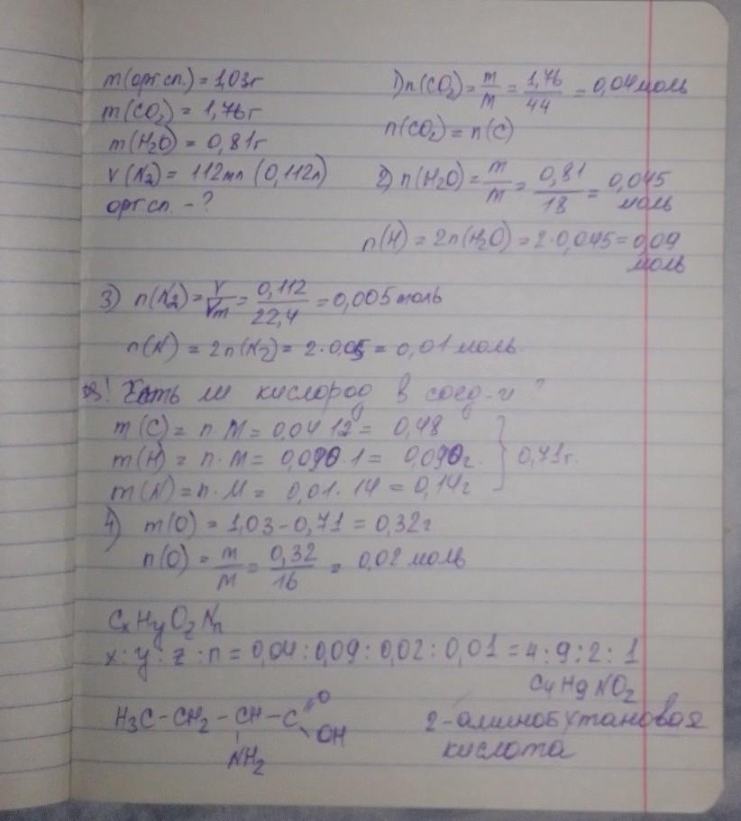 Під час згоряння органічної речовини масою 1,03 г утворилися вуглекислий газ масою 1,76 г, вода масою 0,81 г та азот об’ємом 112 мл (н. у.). Установіть молекулярну формулу речови.