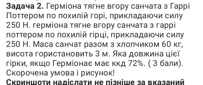Задача 2. Герміона тягне вгору санчата з Гаррі Поттером по похилій горі, прикладаючи силу 250 Н. герміона тягне вгору санчата з гаррі поттером по похилій гірці, прикладаючи силу 250 Н. Маса санчат разом з хлопчиком 60 кг, висота гористановить 3 м. Яка довжина цієї гірки, якщо Герміонає має ккд 72%. ( 3 бали). Скорочена умова і рисунок!