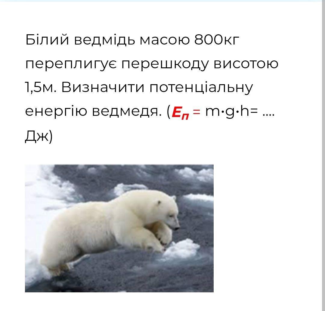 В момент, когда медведь находится на высоте 1,5 метров, относительно начала отсчёта, его потенциальная энергия рассчитывается как Eп=mgh=800 кг * 10 м/с^2 * 1,5 м = 12000 Дж = 12 кДж