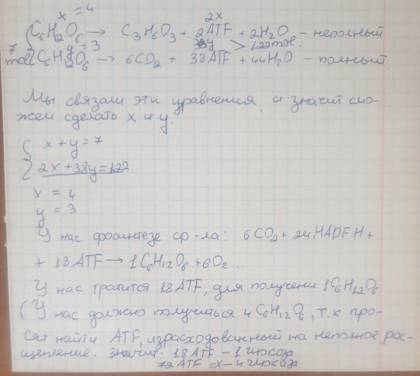 У нас 7 моль глюкозы. Часть подвергается неполному, часть полному расщеплению. При этом образовалась 122 АТФ. При неполном расщепление x моль глюкозы образуется 2x АТФ. При полном расщеплению Y глюкозы образуется 38Y АТФ. Делаем двойное уравнение. у нас глюкозы, подвергший неполному расщеплению выйдет 4 моль. Для синтеза 1 моль глюкозы в процессе фотосинтеза, требуется 18 АТФ. Но нам требуется 4 моль глюкозы, значит требуется 72 АТФ ( По пропорции ).