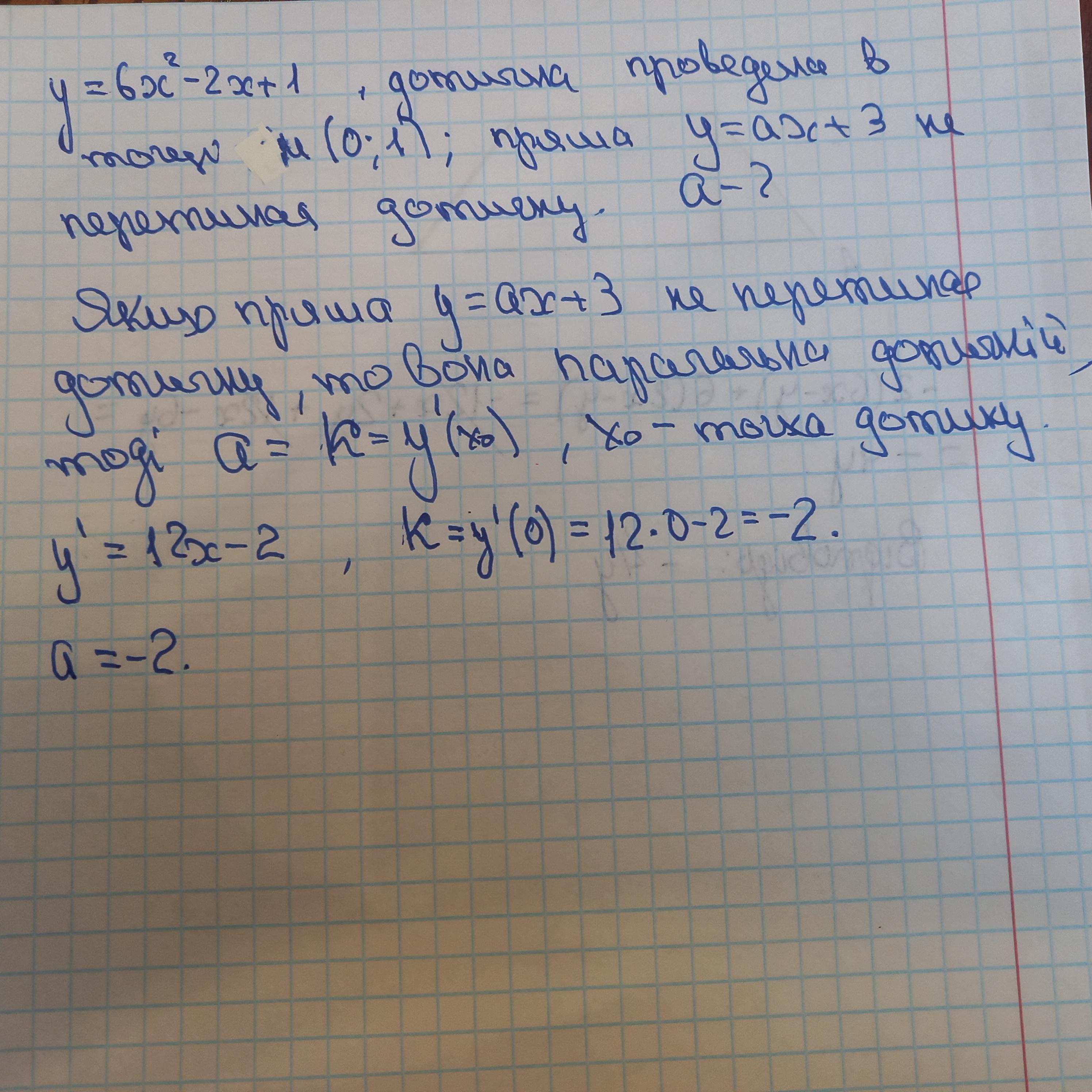 2. При яких значеннях параметра а пряма у = ах + 3 не перетинає дотичну до графіка функції у = 6х2 – 2х + 1, проведену в точці М(0; 1)? Якщо таке значення одне, то запишіть його у відповідь; якщо таких значень кілька, то запишіть у відповідь їхню суму.