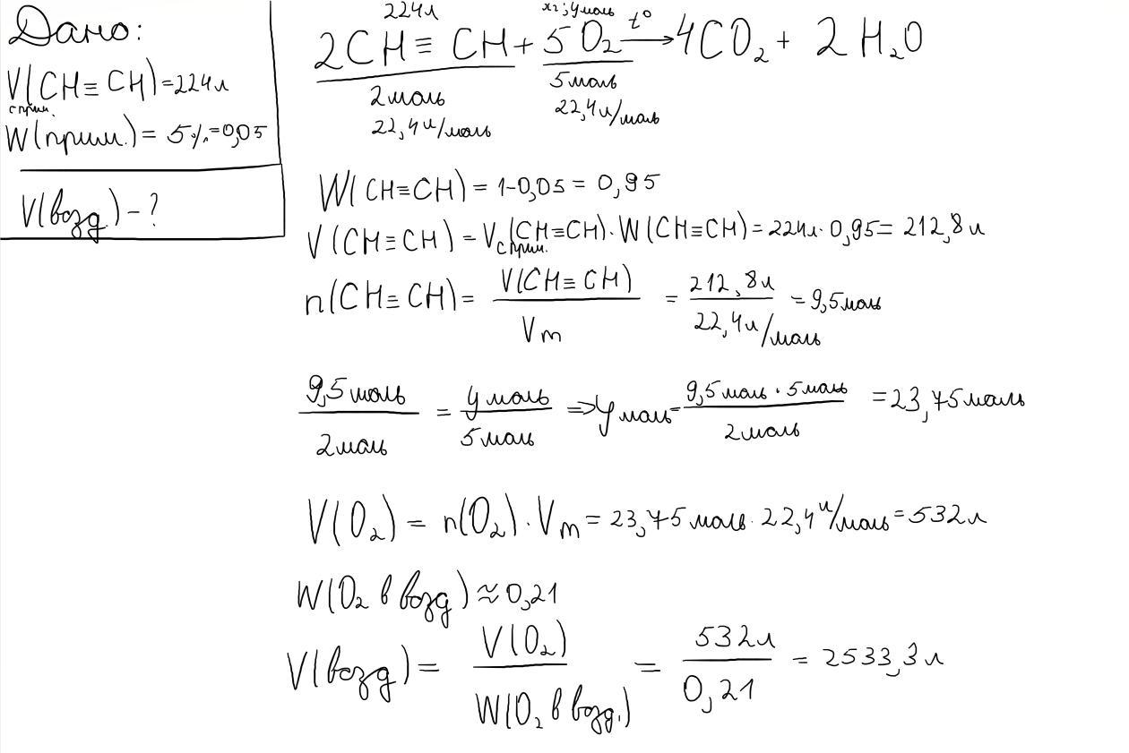4) V(O2) = V чист.(C2H2) * 5 / 2 = 212,8 * 5 / 2 = 532 л;