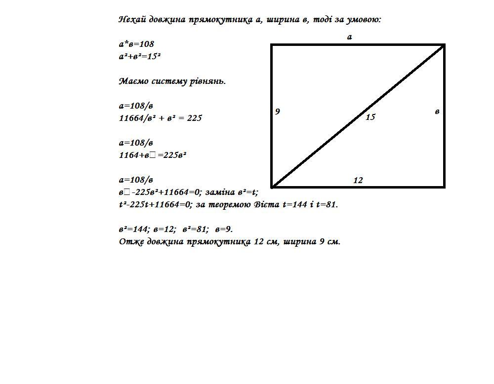 Площа прямокутника дорівнює 108 дм², а діагональ 15 дм. Знайдіть сторони прямокутника. СРОК СДАЧИ СЕГОДНЯ!!! ПОМОГИТЕ ПОЖАЛУЙСТА!!!