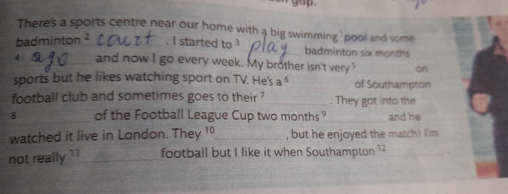 Spain therle Complete the blog with one word in each gap. dak agot There's a sports centre near our home with a big swimming pool and some badminton ² Court I started to 3 2 play 4 ago badminton six months and now I go every week. My brother isn't very 5 of Southampton They got into the and he but he enjoyed the match football but I like it when Southampton 12 sports but he likes watching sport on TV. He's a 5 football club and sometimes goes to their 7 10 of the Football League Cup two months 9 watched it live in London. They not really ¹1 8 on