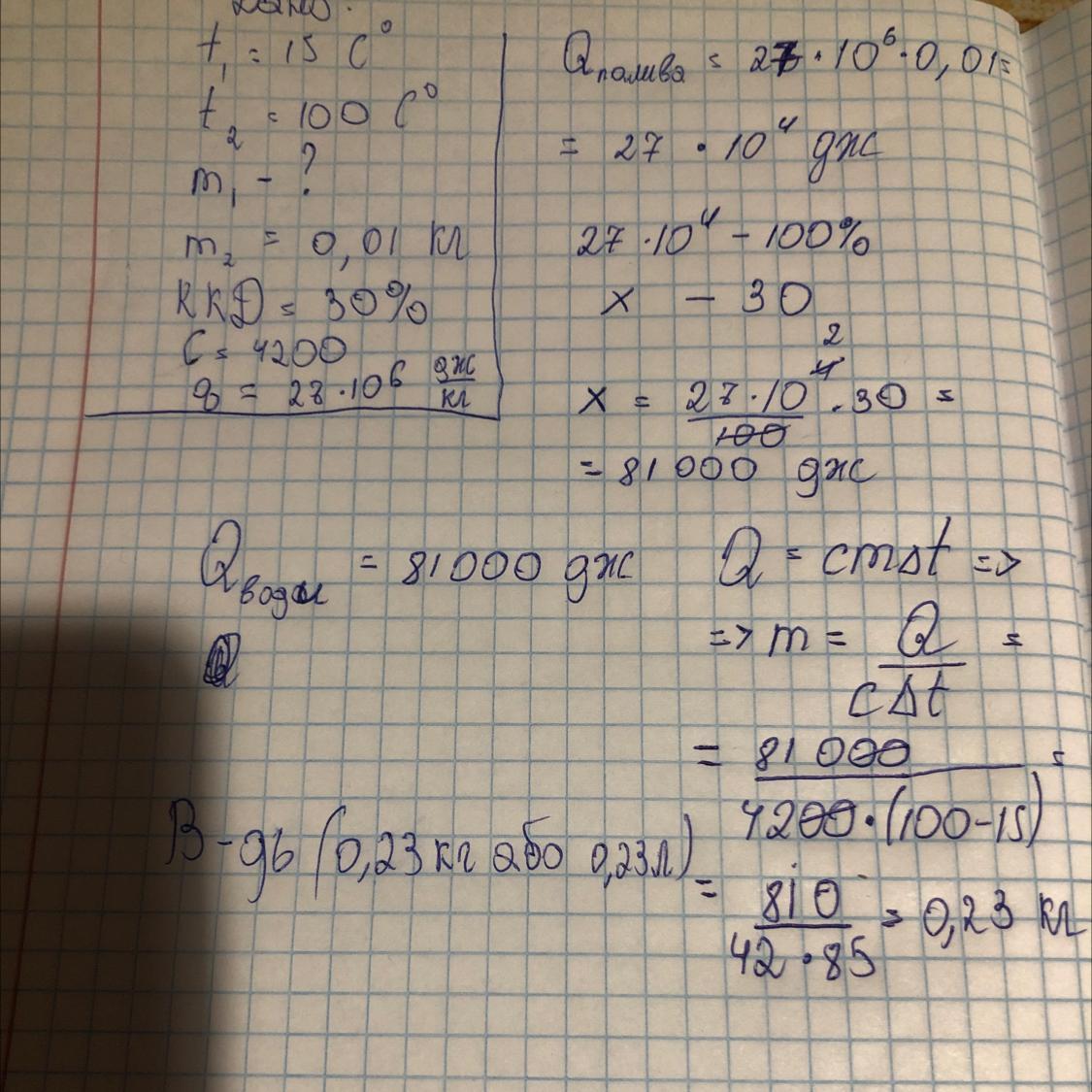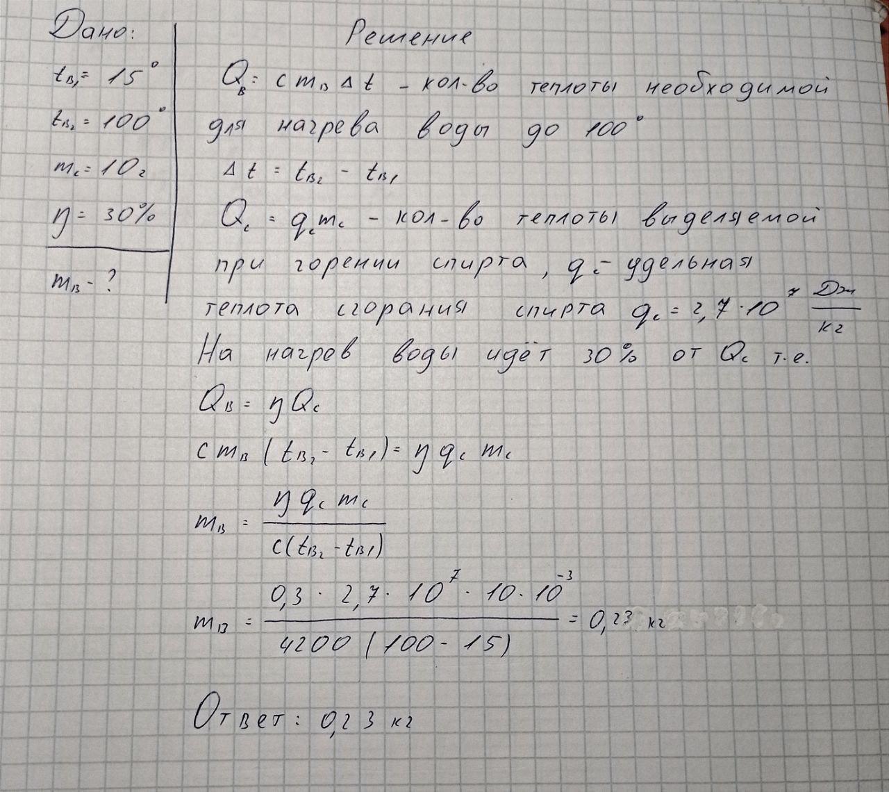 Скільки води, взятої при 15°C, можна нагріти до кипіння, спаливши 10г спирту, якщо ККД спиртівки дорівнює 30%?
