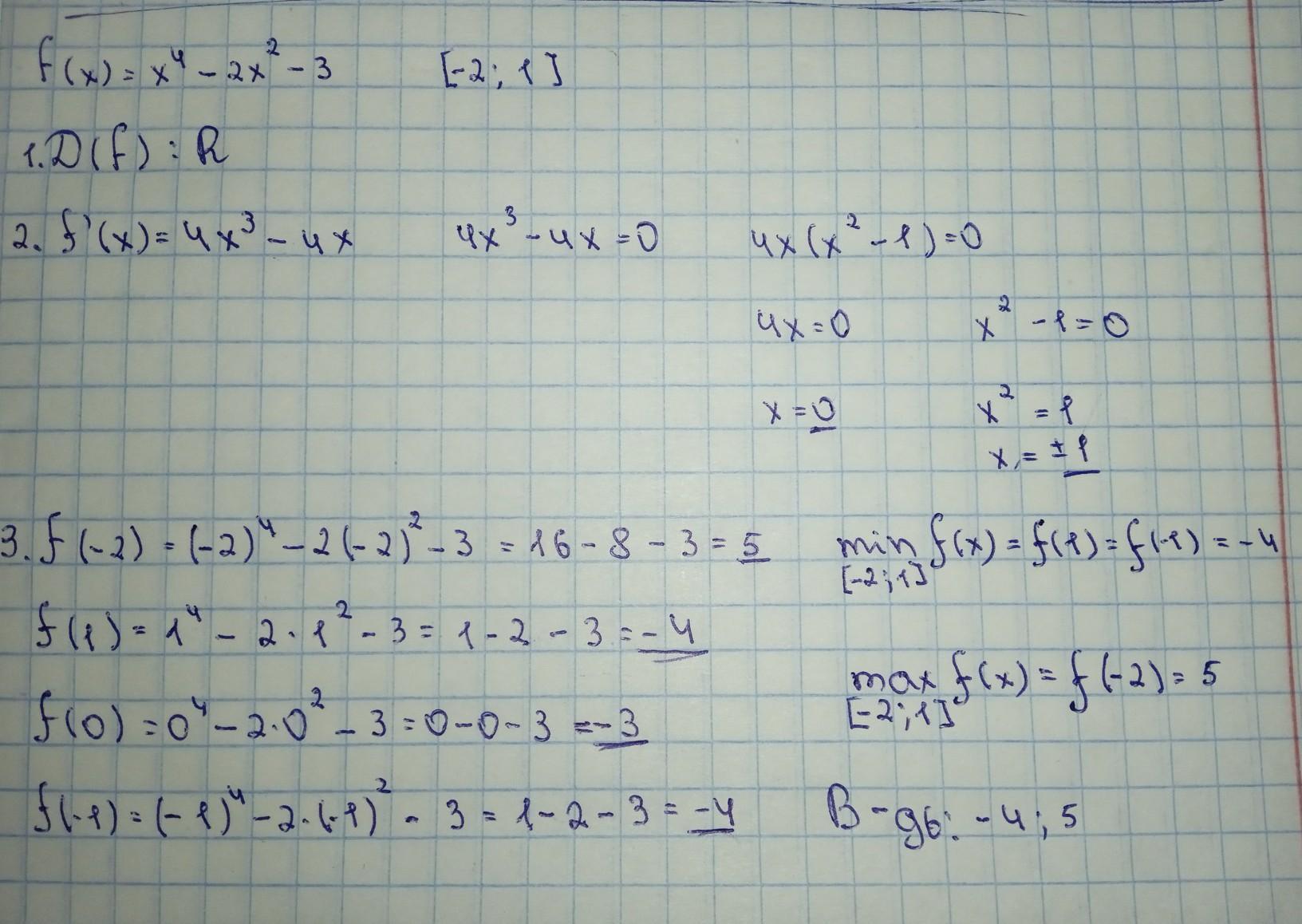 Визначити найбільше і найменше значення функції f(x) = x⁴- 2x²- 3 на відрізку [-2;1]. Якщо можно то малюнком